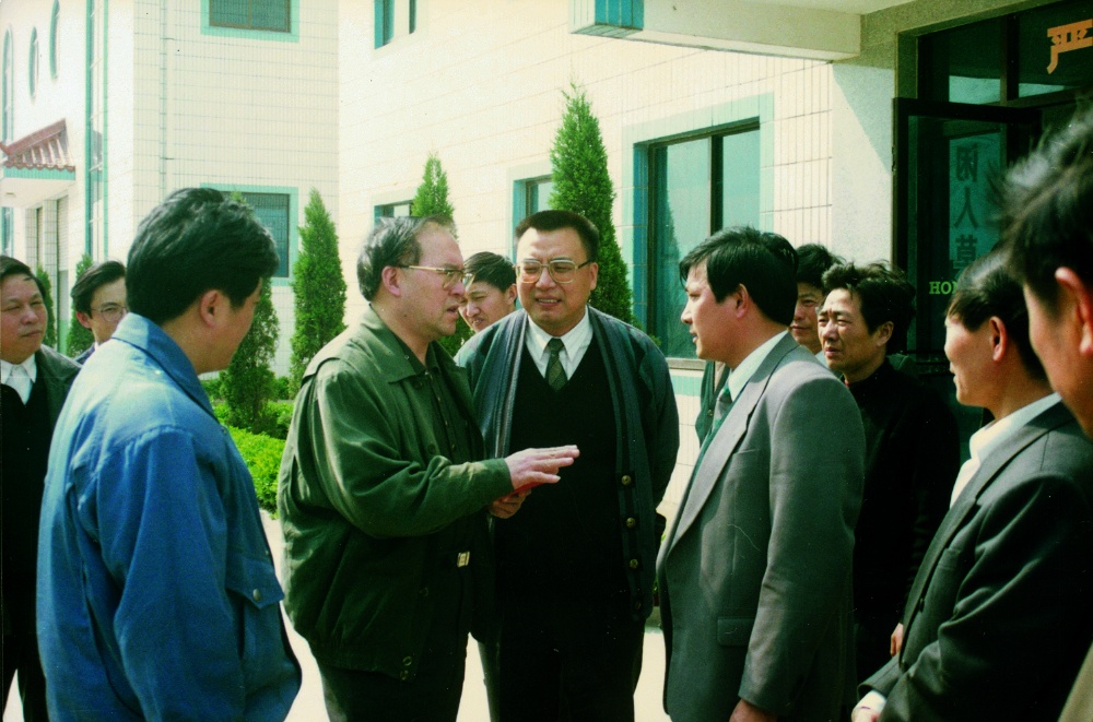 原國家人事部副部長、時任浙江省省長萬學遠(左二)等領導在浙江宏達經編股份有限公司指導工作