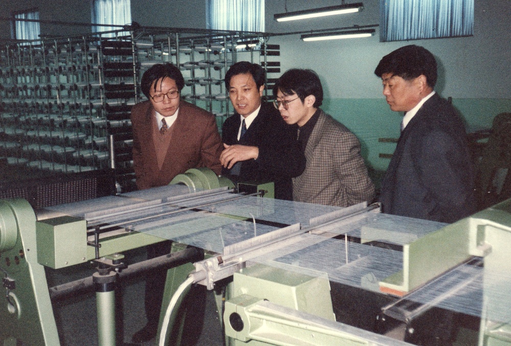 時(shí)任海寧市市長(zhǎng)應(yīng)忠良(左)在浙江宏達(dá)經(jīng)編實(shí)業(yè)公司車間