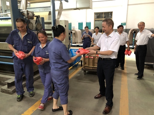 公司領導們,來到染整二部、染整一部等部門,向在高溫天氣中堅守崗位的一線員工表示親切的慰問和感謝。在生產(chǎn)現(xiàn)場,囑咐大家高溫生產(chǎn)不忘安全,做到勞逸結合;也要求各部門切實做好防暑降溫工作,保障員工健康安全。