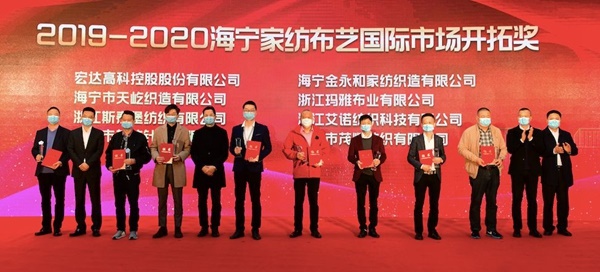 2020年3月16日,海寧中國·國際家用紡織品云博會在“家紡城”國貿(mào)中心隆重舉行,宏達高科控股股份有限公司在會上榮獲“海寧家紡布藝國際市場開拓獎”,總經(jīng)理許建舟代表公司上臺領(lǐng)獎。