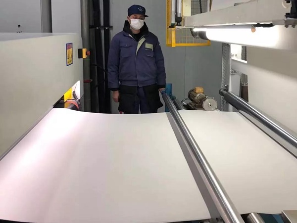 復工當天,車間內,只見員工們戴著口罩在生產線上忙碌。由于生產設備高度自動化,一名員工可以看管5至6臺設備,因此車間內人員并不密集,生產也是井然有序。正在生產的這批汽車頂蓬面料,后天將發給客戶,以滿足客戶的需求。公司副總經理孫云浩表示,公司目前已開啟織造和復合兩條生產線,等集中供熱啟動后,公司染整生產線也將恢復生產;后續將根據產業鏈上游的供應情況和下游的客戶需求情況逐步提升產能,爭取在15日全部恢復生產。