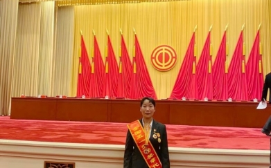 2021年4月28日上午,宏達高科管委會領導為公司織造部趙巧娟領獎歸來舉..